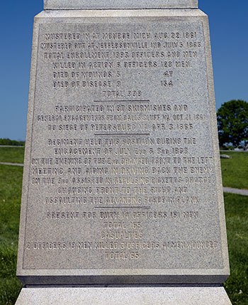 Mustered in at Detroit, Mich. Sept. 8, 1861. Total enrollment 2318 offices & men Participated in 52 skirmishes and general engagements from Yorktown, Va. May 4, 1862 to Appomattox, Va., April 9, 1865 and was one of the regiments detailed to receive Lee’s Army with its arms and flags on April 9, 1865. Regiment held this position during the afternoon and night of July 2, 1863, and assisted in defeating the desperate attempts of the enemy to capture Little Round Top. Present for duty 17 officers, 339 men total 356. Casualties: 3 officers 20 men killed, 2 officers 32 men wounded, 3 men missing. Total 60.