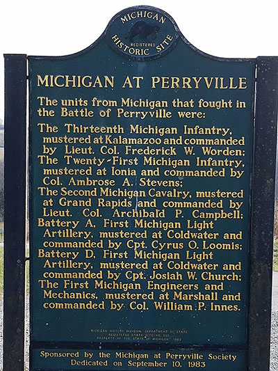 Marker Text: Among the 61,000 Union soldiers who at the Battle of Perryville ended Confederate attempts to gain control of Kentucky were six Michigan uits. The most heavily engaged of these were Coldwater's Loomis Battery (Battery A of the First Michigan Light Artillery), the Second Michigan Cavalry and the Twenty-First Michigan Infantry. During the course of the battle, Battery A, epuipeed with six ten-pounder Parrott guns, prevent the right flank of General Daniel McCook's corps from being turne and aided in the repulse of General Patrick Cleburne's Rebel brigade. At one point, Looms was ordered to spike his guns and leave them. By refusing, he retained a key position. Battery A is reported to have fired the first and the last artillery rounds of the battle