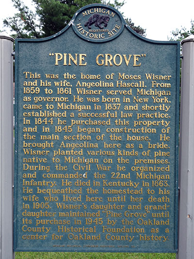 Marker Text: This was the home of Moses Wisner and his wife Angeolina Hascall. From 1859 to 1861, Wisner served Michigan as governor. He was born in New York, came to Michigan in 1837 and shortly established a successful law practice. In 1844 he purchased this property and in 1845 began construction of the main section of the house. He brought Angeolina here as a bride. Wisner planted various kinds of pine native to Michigan on the premises. During the Civil War he organized and commanded the 22nd Michigan Infantry. He died in Kentucky in 1863. He bequeathed his homestead to his wife who lived here until her death in 1905. Wisner's daughter and grand-daughter maintained "Pine Grove" until its purchase by the Oakland County Historical Foundation as a center for Oakland County history.