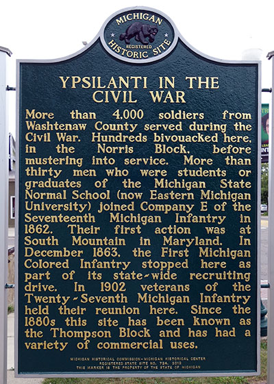 Marker Text: When the Civil War began in 1861, this corner site housed a commercial building called the Norris Block. Its location across the street from the railroad station made it an ideal place for short-term lodging for enlistees waiting to be sent off to battle, and locals soon dubbed it The Barracks. The Ypsilanti Light Guard, a local militia company that became Company H, First Michigan Infantry, stayed here in the spring of 1861. They mustered in Detroit on May 1 and arrived in Washington, D.C., on May 16. Recruits for the Fourteenth Michigan Infantry, including 129 men from Washtenaw County, spent six months here from September 1861 to February 1862 while the regiments ranks were filled. The Fourteenth first saw action as part of the siege of Corinth, Mississippi. When the Civil War began in 1861, this corner site housed a commercial building called the Norris Block. Its location across the street from the railroad station made it an ideal place for short-term lodging for enlistees waiting to be sent off to battle, and locals soon dubbed it The Barracks. The Ypsilanti Light Guard, a local militia company that became Company H, First Michigan Infantry, stayed here in the spring of 1861. They mustered in Detroit on May 1 and arrived in Washington, D.C., on May 16. Recruits for the Fourteenth Michigan Infantry, including 129 men from Washtenaw County, spent six months here from September 1861 to February 1862 while the regiments ranks were filled. The Fourteenth first saw action as part of the siege of Corinth, Mississippi.